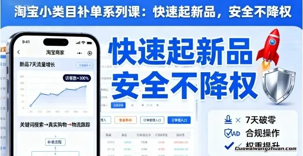 本课程为淘宝小类目补单实战课,系统解析补单全流程(4种方式解析/4大优势详解)、降权风险(4大稽查因素/4种降权场景)及安全操作(基础操作/规避技巧),通过14个核心模块帮助新品快速起量。课程强调安全合规,学员可掌握7天提升搜索排名50%+的技巧(案例显示单店月增收3w+)。