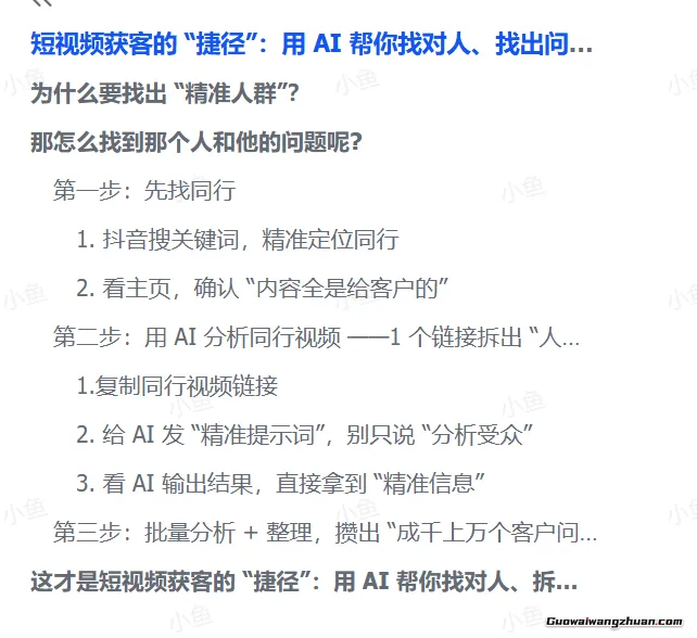 更可惜的是,很多人不知道:不用自己调研、不用问遍客户,靠 AI 就能从同行视频里找出 “真实客户需求”,比如谁在看、他们烦什么、想要什么解决方案,连选题都能直接用AI帮你整理出来。