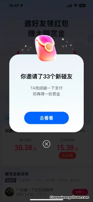 碰一碰也有推广赚赏金的活动,就是邀请用户扫推广码,咱们自己就能够获得佣金奖励,然后自己去购物消费等等,和之前的赚钱红包码原理是一样的。