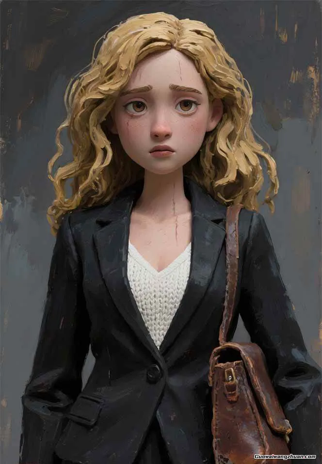 她有一张精致的、略显憔悴的脸庞,被她那长长的金色波浪卷发,每一缕发丝都像是用厚涂技法(impasto)精心塑造的,带有清晰的笔触痕迹。她那双杏仁状的大眼睛忧郁地低垂着,小巧而精心雕琢的嘴唇微微张开。她身着一套剪裁利落的黑色西装,西装外套的布料上能看到哑光的、有质感的笔触。西装内搭一件洁白的白色v领毛制吊带,其针织纹理通过精细的油彩凸起巧妙地表现出来。她的一只胳膊上挎着一个牛皮包,包的表面呈现出一种带有磨损感的皮革质地。