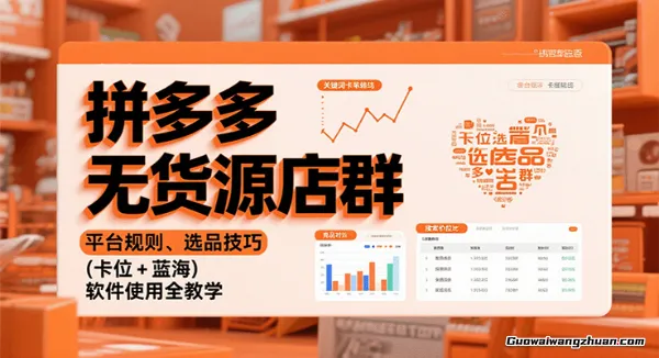 本课程为拼多多无货源店群运营全体系,涵盖规则解读、蓝海选品、标题优化三大核心模块。通过25节课程系统讲解平台规则、季节性选品、三维标题制作等技巧,结合软件工具使用与售后维护策略,帮助学员掌握零成本开店全流程。