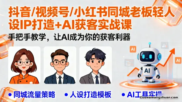 这是一门专为实体老板打造的短视频轻人设IP实战课程,系统讲解抖音、视频号、小红书三大平台的流量算法与运营策略,内容涵盖老板IP定位、爆款脚本创作、拍摄剪辑技巧、内容运营及AI创作等核心模块,通过人设打造实现同城获客与成交转化,帮助实体商家低成本高效获取客户。