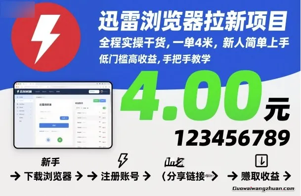 迅雷浏览器是一个新产品,不是迅雷网盘,拉新价格为一单4元,虽然这单价不算高,但是这个新产品市场空间大,下载的人也不多。