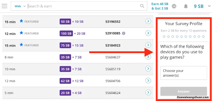 完成的调查通常奖励50到500SB,相当于0.50到5.00美元现金。根据我们的经验,你将有资格参与你个人资料上列出的大约20%到25%的调查。