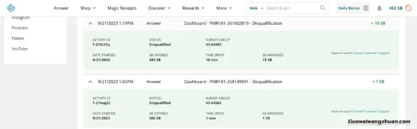 人们对调查网站的一个常见抱怨是,有时你会被踢出调查,但你无法知道这是系统故障还是你被取消了调查资格。这种模糊性多年来损害了在线调查领域的声誉,但我非常喜欢Swagbucks的一点是,它在你的个人资料(仪表板右上角)下透明地提供了一个活动历史记录,显示你在网站上的每项活动赚取了多少SB,包括调查取消资格。