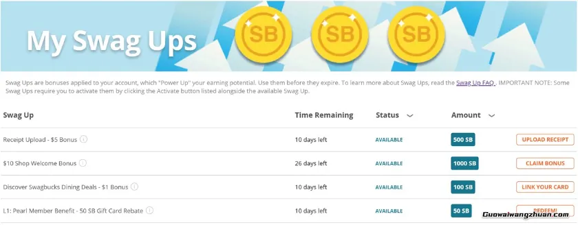 Swagbucks偶尔会提供赚取更大奖金或暂时解锁更高SB获取率的方法。例如,10美元的欢迎奖金在技术上就是一个可用的赚币加成。