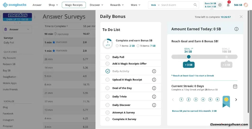 Swagbucks会根据你之前的收入历史为你设定一个定制的每日收益目标。