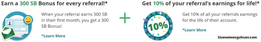 当他们注册并开始使用该网站时,如果你的推荐人在前30天内赚取了300点或更多积分,你将获得300 SB。此外,只要他们的账户保持活跃,你将赚取其终身收入的10%。