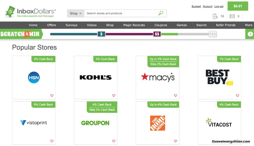 InboxDollars提供数百家商店的返现,包括百思买 (Best Buy)、家得宝 (Home Depot)、Groupon和科尔百货 (Kohl’s)。优惠因店而异,有些提供低至1%的返现,有些则高达25%。 你可以通过浏览InboxDollars的零售商列表或按名称或类别搜索,直接在InboxDollars账户内购物。像许多其他返现网站一样,他们也有一个名为比利按钮 (Billy Button) 的浏览器扩展程序,你可以添加到浏览器中。