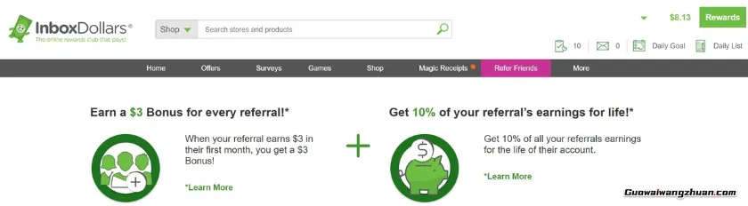 通过InboxDollars的邀请好友计划,每邀请一位好友在其第一个月内赚取3美元,你将获得3美元现金奖励。此外,你还能赚取推荐好友终身收入的10%。 奖金将在用户达到3美元门槛后24小时内计入账户,因此可能不会立即显示。