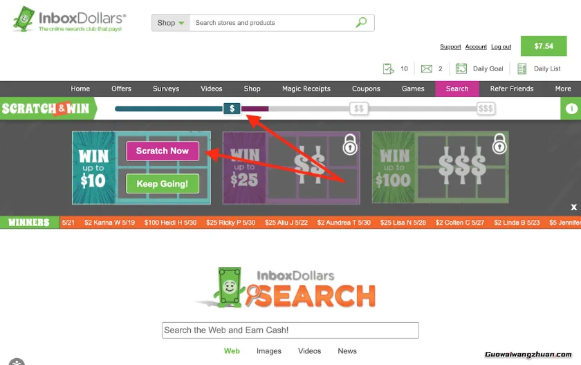 我们之前在游戏和搜索部分简单提到过这些。当你在InboxDollars上完成调查、玩游戏和参与其他活动时,你将获得“刮刮乐”卡片的进度,这基本上就是一张带有随机奖励的数字彩票。