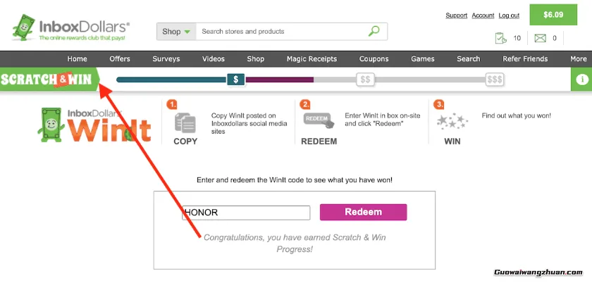除了调查、魔法收据和其他在InboxDollars上赚取返现的主要方法外,你还可以通过“刮刮乐”(Scratch & Win)、“赢取码”(WinIt codes) 和达成连续“每日目标”(Daily Goal streaks) 来赚取额外奖励。