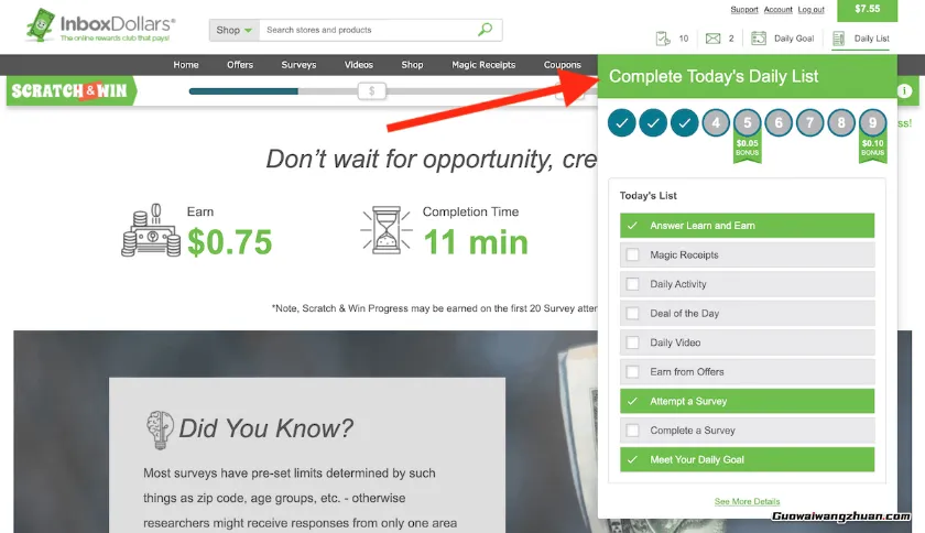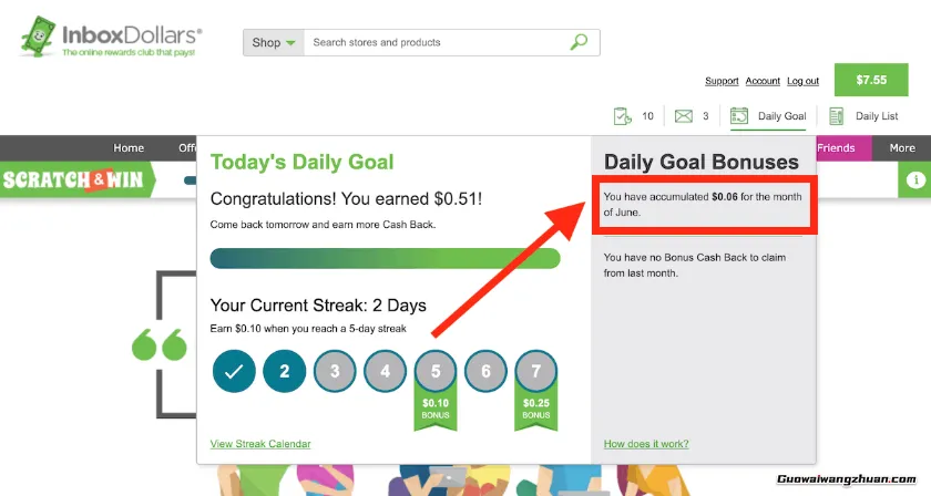 每当你达成每日收入目标或完成每日待办事项清单时,InboxDollars会奖励你0.03美元到0.10美元的奖金。InboxDollars根据你过去的收入记录来设定你的每日目标。