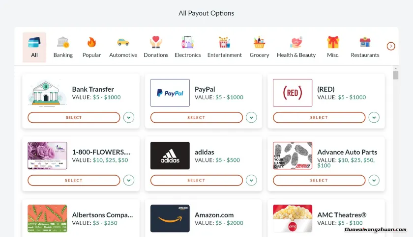 一旦你积累了价值5美元的500点积分,就有资格提现收益。你可以选择免费的PayPal转账或通过Branded Pay(其专有的支付选项,允许美国用户直接收款到银行账户)获取现金。你也可以将积分兑换成亚马逊(Amazon)、苹果(Apple)和布法罗鸡翅(Buffalo Wild Wings)等地方的礼品卡,或捐给慈善机构。