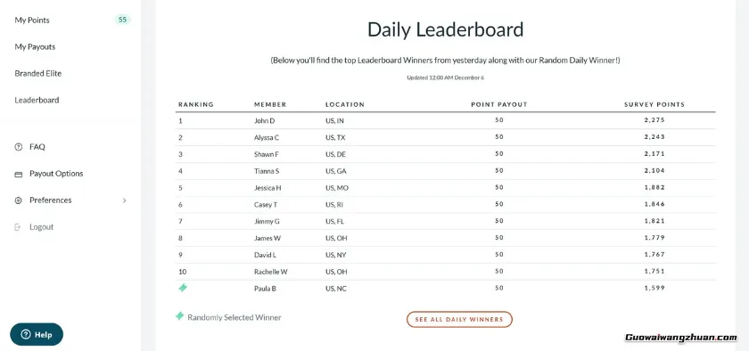 Branded Surveys提供用户间的友好竞争,鼓励他们尽可能多地参与调查以登上排行榜顶端。保持在排行榜顶端,你可以获得高达1000点奖励积分,还有机会参与额外积分的抽奖。