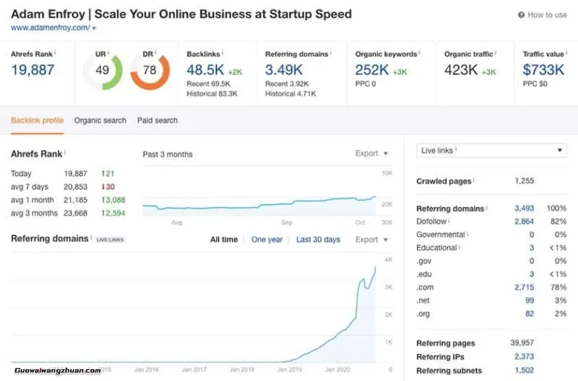 高质量的反向链接与网站在搜索引擎上的排名能力之间存在直接关联。如果你看看我博客的Ahrefs个人资料,你会发现自然流量大幅增长。这是高质量内容以及指向我博客的引用域和反向链接大幅增加的结果: