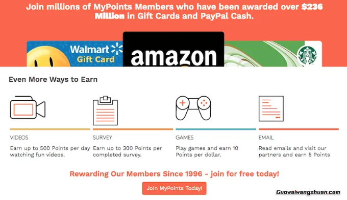 MyPoints注册简单,当你创建账户时,它会提供价值10美元的亚马逊或Visa礼品卡。你只需提供姓名和电子邮件地址。