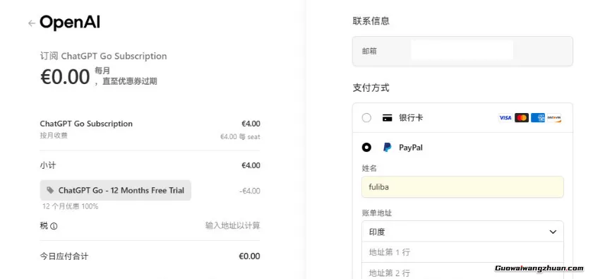 然后再点升级至Go,就发现付款页面出现PayPal选项了,此时建议也是用新的 PayPal (国区也可以)。